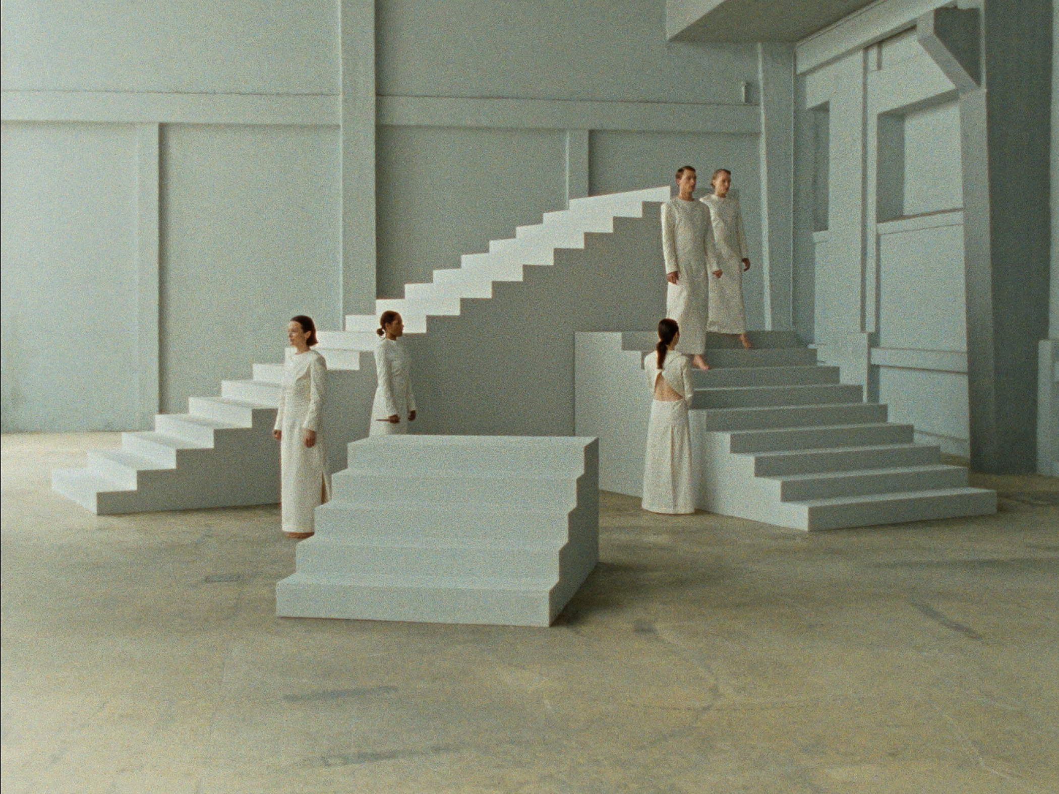 Images, scenes, ballast. Mantra and metamorphosis. In the three new films by Antoinette Zwirchmayr, women figures find themselves in various spatial and temporal constellations. We witness formalized sequences and gestures in stage-like architectures or against enchanting natural backdrops, accompanied by powerful words. The dense language of playwright Dea Loher in Land Without Words (2024) and—hauntingly reduced—in YahneYahne Or the Drowned Child (2025) ultimately makes way for the siren-like singing of musician Teresa Rotschopf in Currents And Orders (2025). The cinematic conjuring of presence is narratively interlaced with various facets of temporality.