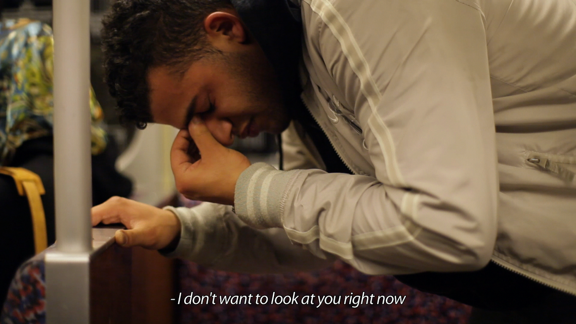 Nyx, named after the goddess of the night, takes its viewers on the psychedelic journey of the young man Furat. He cannot understand why he is intoxicated after ‘just two beers’, and his nocturnal U-Bahn journey home turns into a trip through the underworld. The film is set in the stations of U-Bahn line 7, designed by Rainer Rümmler between 1971 and 1984, along the route between Neukölln, the Turkish neighbourhood of Berlin and Spandau. Hooper had already filmed the imaginative architecture of these underground stations with their many art deco and oriental style details in 2008 in her video Nach Spandau, where she almost voyeuristically pictured the stations one by one at night and mainly empty. In Nyx they become the scene of Furat’s journey, which begins with an encounter with Thanatos, the god of peaceful death, his twin brother Hypnos, the god of sleep, and the latter’s wife Pasithea, goddess of hallucination.