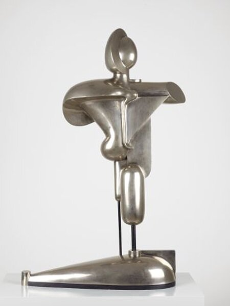 Oskar Schlemmer created this abstract figure in the years from 1921 to 23. It is done in nickel-plated bronze, the shining surface reflects the light and so achieves an affected of brilliance. The main theme in Schlemmer’s art is the representation of human figures. He composes the sculpture by combining various geometrical forms. The absence of certain elements such as arms and legs does not detract from its overall affect as a figure. Together with the long extended plinth it forms a finally balanced unity. In 1924 the artist notes: „The figure is not to be grasped in one moment. It needs a temporal sequence of position and line of vision. A coercion to move around arises, and only by walking around and the sum of the impression so gained, can one really grasp the sculpture. The different positions and angles of the variety of visual experiences, the sum of these experiences yields the overall view of the figure. Oskar Schlemmer made numerous paintings and also wall-paintings devoted to the theme of man. Running the stage class at the Bauhaus he worked a lot on stage illustrations and design costumes for his Triadic Ballet.