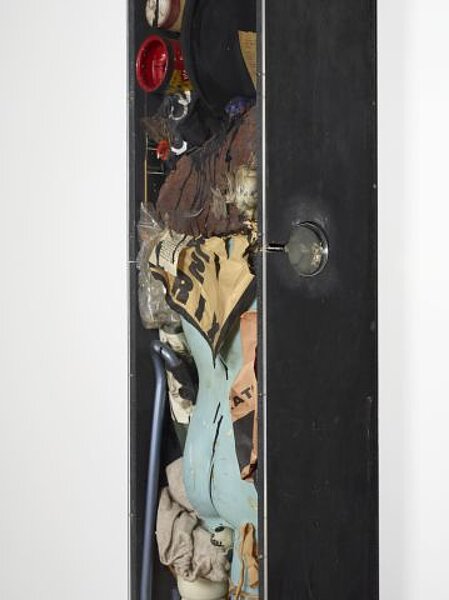 In fall 1960, French artist Arman filled the Paris gallery Iris Clert with trash and scrap metal. This exhibition, entitled "Le Plein" (Plenty) turned Arman into a star overnight. It was a response to Yves Klein’s exhibition "Le Vide" (The Void), which had taken place two years earlier in the same gallery, and which presented nothing more than an empty gallery painted white and lit by one blue lamp. It was with piles of objects, which Arman called accumulations, that the artist secured his place in art history. Some of these can be seen as a critique of consumerism in the new throw-away society of the 1960s, while others present the diversity and specificity of seemingly identical objects, or they refer to a specific person, as in the work shown here. “Portrait-robot” means a phantom image. Viewers are invited to search for a “picture” of a certain person hidden in the objects collected here in a box. Arman is working with the idea that it is not the appearance of someone that characterizes them, but the things that that person uses and collects. We can see paint tins, dolls, a hat, a number of pens, boards and pieces of paper with writing, a stuffed bird, and a female torso. All of these objects belonged to the person searched for—named Ben. This is Ben Vautier, born in 1925 in France, a friend of Arman and also an artist. In the years when this “phantom image“ was made, he had a small shop in Nice, called Magasin, in which he made the act of selling and trading art into the subject of his art, and in which he sold all kinds of bric-a-brac. Vautier gained international renown with his small black pictures on which he noted down his ideas on art and the art scene, in free-flowing handwriting using a paintbrush and white paint. There is a small picture by Vautier in the top right of this box.