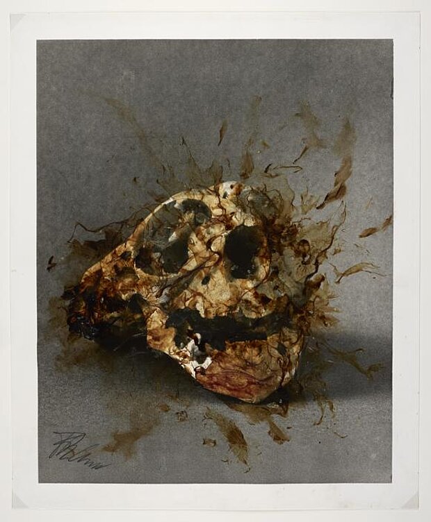 | Objektbeschreibung | Silber-Gelatine Handabzug, überarbeitet mit Öl, Asphalt, Tinte, Haut, Chemikalien |